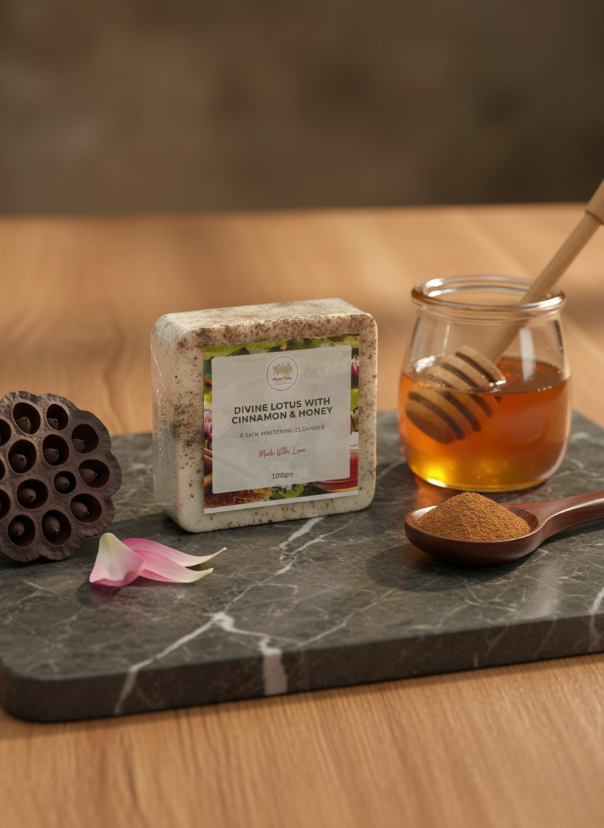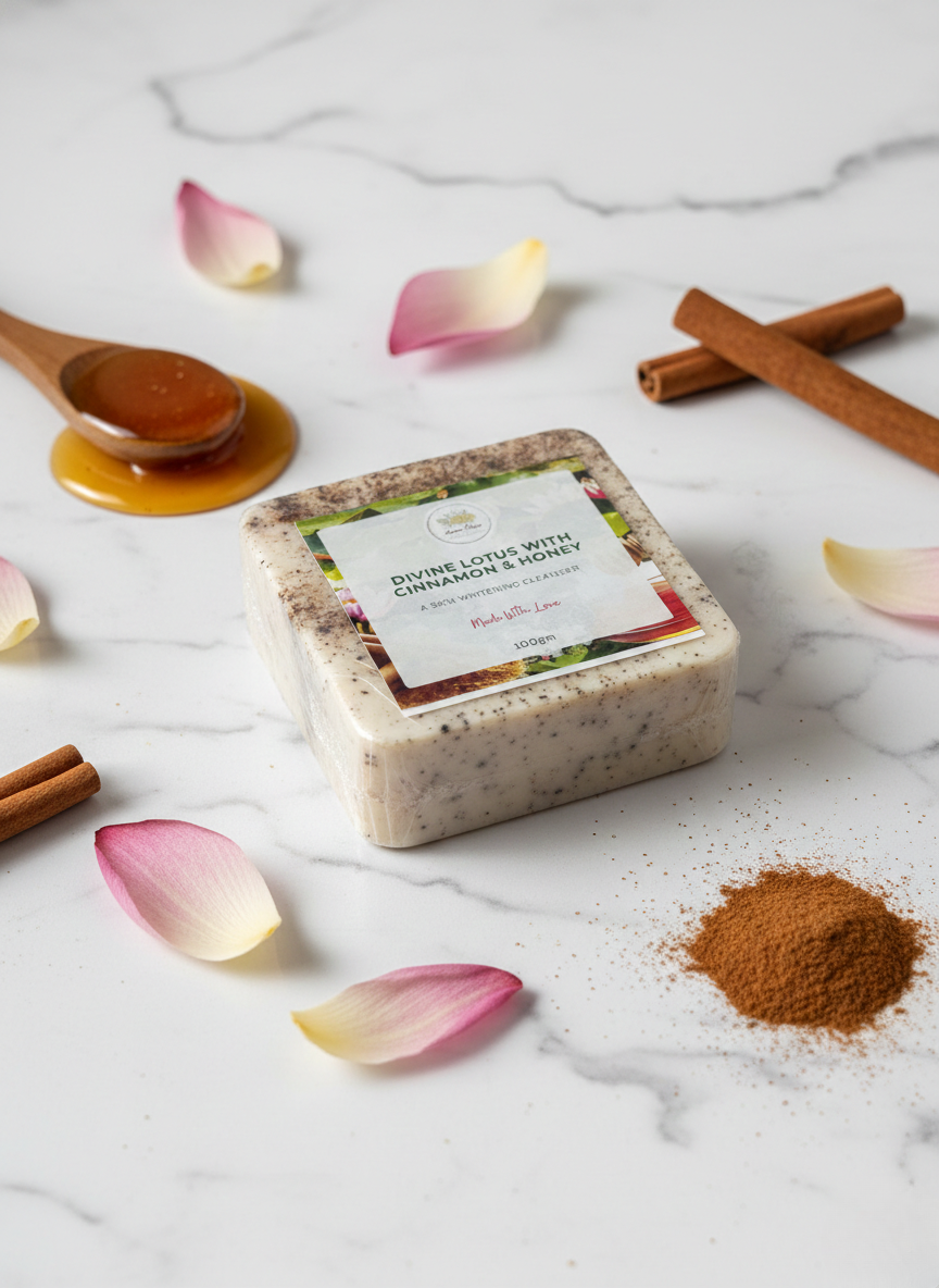 Divine Lotus With Cinnamon & Honey Soap is a natural herbal cleansing bar enriched with lotus extract, cinnamon, and pure honey. It helps cleanse the skin deeply while maintaining natural moisture.